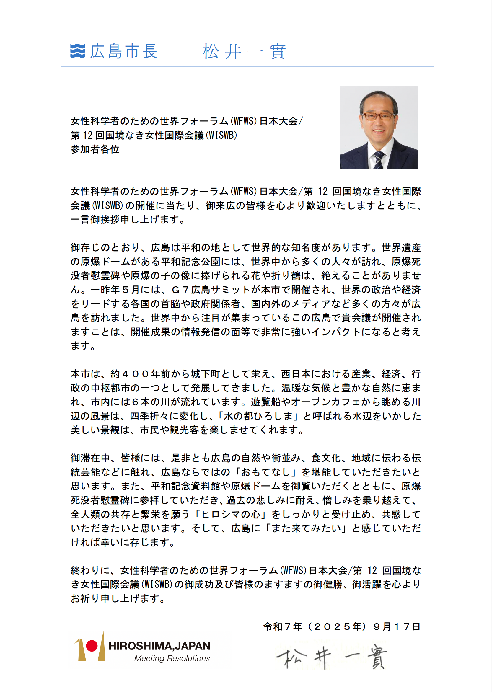 Welcome message from Mr. MATSUI Kazumi, Mayor of the City of Hiroshima